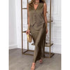 V-HALS, MOUWLOOS ONTWERP – EEN VLEUGJE TIJDLOZE CHARME: De top heeft een flatterende V-hals en een mouwloos silhouet dat het sleutelbeen perfect accentueert en tegelijkertijd ademend is op warme dagen. De knoopsluiting voegt visuele aantrekkingskracht en functionaliteit toe, waardoor de outfit eenvoudig maar elegant is. Dit ontwerp versterkt je aanwezigheid, of je nu een tuinfeest of een semi-formeel evenement bezoekt.